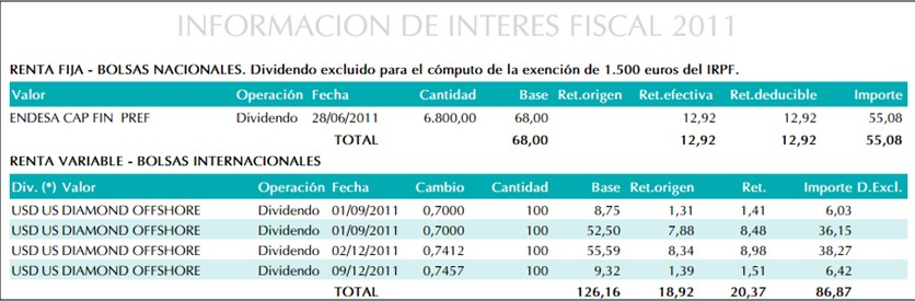 Da gusto comprobar cómo 18.92 es, exactamente, el 15% de 126.16 -cifra, esta última, que equivale a la suma del importe total de los dividendos conseguidos en 2011 a través de mi participación en Diamond Offshore (DO), una empresa de Texas que se dedica a la extracción de petróleo en altamar.