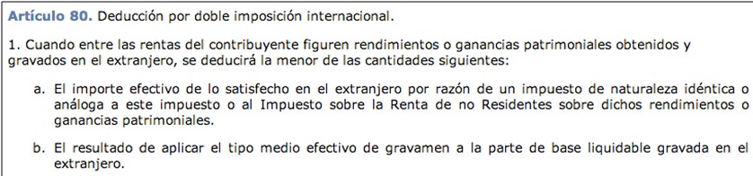 Antes de abordar un ejemplo, déjenme que les presente el artículo de la Ley del Impuesto de la Renta sobre Personas Físicas (LIRPF) donde se aborda la deducción por doble imposición internacional (Artículo 80). Aquí está: