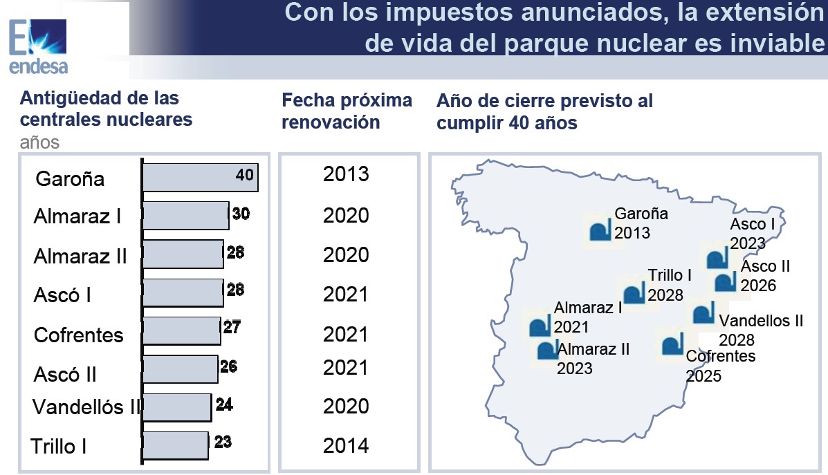 "El parque nuclear español (7.455 MW, incluida Garoña) cerrará progresivamente a lo largo de la próxima década, porque las inversiones de extensión de vida útil (más allá de los 40 años) se hacen inviables con los nuevos impuestos y tasas", alerta.