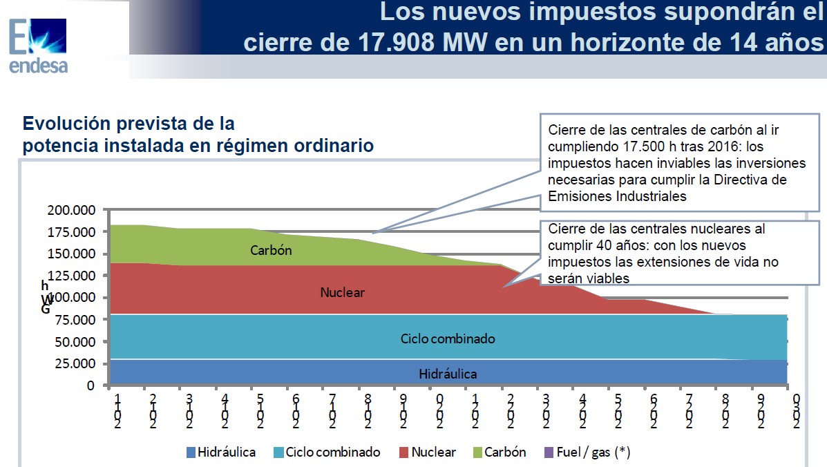 Pero no será la única, según los expertos. Durante unas jornadas celebradas el pasado lunes por la Real Academia de Ingeniería (RAI) sobre los problemas del sector energético, José Casas Marín, subdirector general de estrategia, regulación, medioambiente y desarrollo sostenible de Endesa, alertó de que los nuevos impuestos acabarán provocando el cierre de todo el parque nuclear español a partir de la próxima década, así como de las centrales térmicas que emplean carbón.