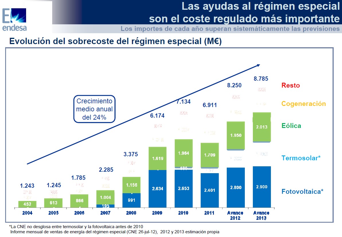 El origen del problema, según Álvarez, estriba en la negativa de los políticos a repercutir el coste real del sistema sobre el precio final de la electricidad que pagan consumidores y empresas, ocultando así las graves deficiencias existentes desde hace años, "unos costes que no han dejado de subir desde 1998" como consecuencia de la burbuja de las renovables -englobadas en el régimen especial-, tanto por el aumento de las potencia instalada como de las primas.