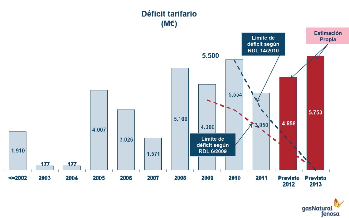 El encuentro reunió a expertos de las cinco grandes compañías del sector energético español, y a excepción de los representantes de Acciona (eóllica) y Abengoa (solar), la mayoría coincidió con este diagnóstico (Iberdrola, Gas Natural Fenosa y Endesa). El déficit tarifario no ha dejado de crecer estos últimos años y se aproxima ya al 3% del PIB, más de 25.000 millones de euros.