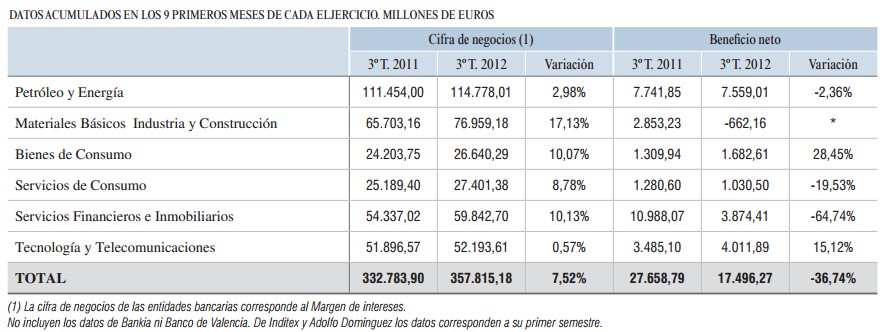 Los resultados de las compañías cotizadas hasta el tercer trimestre de 2012 han cedido un 37% y las ventas aumentaron un 7,5%. Es reseñable el esfuerzo realizado por muchas empresas españolas por avanzar en su expansión internacional. Las ventas en el exterior adquieren cada vez mayor relevancia y están compensado el estancamiento sufrido por la facturación interior. En el primer semestre de 2012, la facturación exterior de las cotizadas españolas aumentó casi un 16% para alcanzar un 59,63% del total.