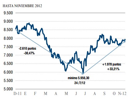 Para el resto de los mercados financieros del mundo, 2012 ha sido un año moderadamente positivo. Los índices de ámbito mundial sumaban ganancias del 11% hasta noviembre, retomando así la senda de recuperación bursátil que comenzaba con sustanciales ganancias en 2009 tras el primer impacto de la crisis, continuaba en 2010 y se quebraba en 2011. La volatilidad en los mercados bursátiles también se ha reducido de manera importante, aunque permanece alta en mercados sometidos a tensiones como la Bolsa española.