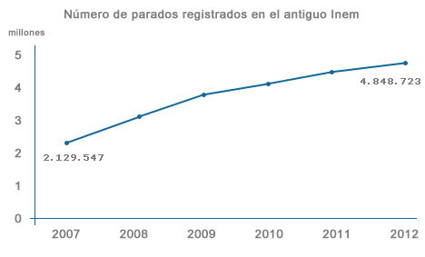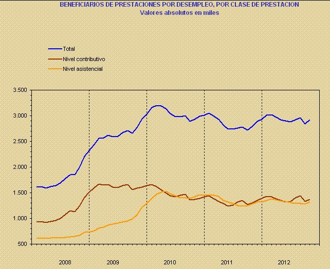 Asimismo, los beneficiarios de prestaciones por desempleo han pasado de 1,53 millones en 2007 a superar la barrera de los 3 millones en noviembre de 2012 (último dato publicado), lo cual se traduce en un incremento de 1,46 millones (un 95% más).