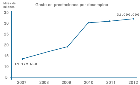 Este sustancial aumento se ha traducido, igualmente, en un mayor gasto público en prestaciones de desempleo. El presupuesto anual destinado a esta partida ha pasado de los 14.470 millones de euros en 2007 a los más de 31.000 millones que, previsiblemente, alcanzará en 2012. Es decir, el gasto estatal destinado a desempleo se ha disparado en 16.500 millones de euros extra al año, un aumento del 114,2% desde el estallido de la crisis. Aunque el Gobierno estimó inicialmente un gasto en desempleo de 28.805 millones para 2012, esta previsión se ha visto superada por la realidad en algo más de 2.000 millones de euros.