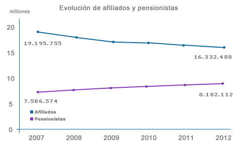 Esta inédita caída de la afiliación tiene consecuencias muy graves para la sostenibilidad del sistema de pensiones. No en vano, mientras han desaparecido 2,86 millones de cotizantes, el número de pensionistas no ha dejado de crecer, al pasar de 7,58 millones en 2007 a 8,18 millones en 2012, casi 600.000 más (un aumento del 7,8%). Como resultado, la ratio de ocupados/pensionistas ha bajado de 2,53 en 2007 a 1,99 en 2012.