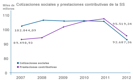 La Seguridad Social presenta un creciente déficit estructural como consecuencia de la caída de la ocupación y el envejecimiento de la población española, tal y como refleja la evolución de los ingresos por cotizaciones sociales y el gasto en prestaciones contributivas (pensiones y otros subsidios). El déficit estructural no ha dejado de aumentar desde 2010, lo cual significa que las cotizaciones sociales no alcanzan para pagar las pensiones contributivas.