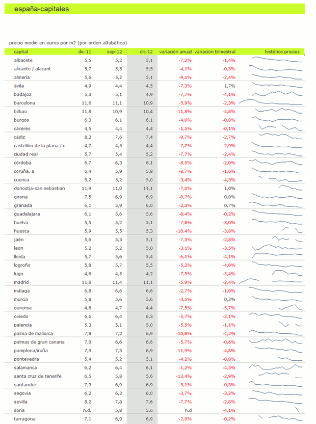 Tras la caída experimentada en 2011, los precios han seguido cayendo en todas las capitales españolas. Los menores descensos se han producido en Salamanca (-1,2%) y Cáceres (-1,5%). Por debajo del 3% están también las ciudades de Granada (2,3%), Málaga (-2,7%) y Tarragona (-2,9%).