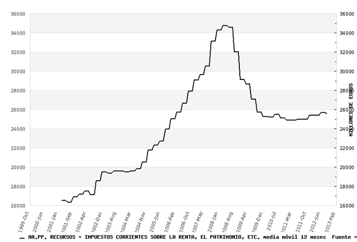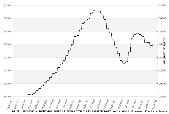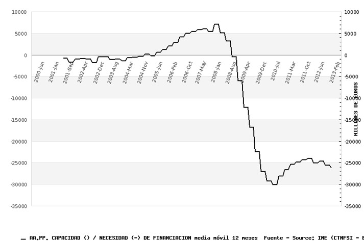 A partir de 2010, las subidas de impuestos y la leve recuperación económica propiciaron una ligera reducción del déficit (aproximadamente un 20%), pero a partir del verano de 2011, éste -tomando cifras de los últimos cuatro trimestres- ha ido empeorando desde 97.152 (de septiembre de 2010 a septiembre de 2011) hasta 104.593 millones (de septiembre de 2011 a septiembre de 2012). Si tenemos en cuenta que el PIB nominal ha bajado en algo menos de 13.000 millones, según los datos oficiales, la situación es todavía peor en términos porcentuales, pues se deteriora desde el 9,1% del PIB hasta el 10%.