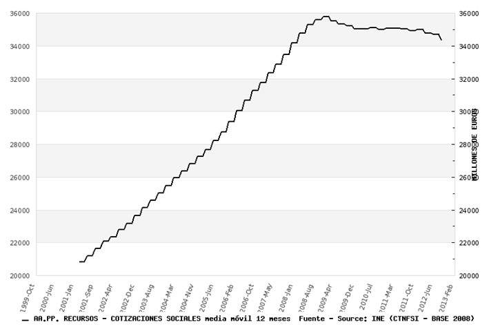 Otra gran partida de ingresos son las cotizaciones sociales. Gracias a las subidas salariales vistas desde 2007 (un 8,7%), el gran descenso visto en el empleo (-12,4%) no ha supuesto un desplome en la recaudación tan grande como en los otros dos casos (-4% desde máximos), pero aun así vemos cómo las bajadas en los salarios medios vistas en 2012 unidas a la acusada destrucción de empleo han hecho que la recaudación caiga con más fuerza que nunca (-1,8% en los últimos tres trimestres).
