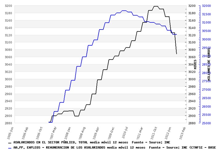 Por la parte de los gastos vemos cómo la remuneración de los empleados públicos se reduce un 2,3%, debido a la bajada del empleo público a la que estamos asistiendo por primera vez desde que comenzó la crisis (-7,1%, según la Encuesta de Población Activa). De todos modos, el gasto en salarios sigue siendo un 12,3% mayor que en 2007. Extraña que el gasto se haya reducido tan poco si el empleo público ha bajado tanto como dice la EPA. En el gráfico siguiente se ve la evolución comparada de ambos datos.