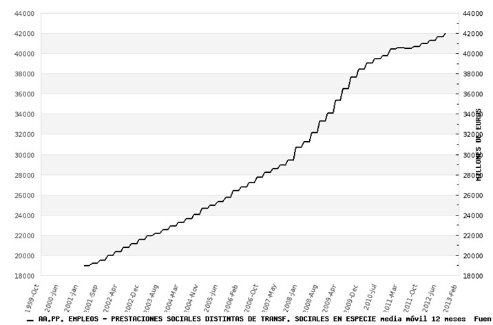 La partida más grande del gasto son las pensiones y prestaciones por desempleo, que es lo que vemos en el siguiente gráfico. Aumentan un 3,4% durante este año, a pesar de la moderación en las pensiones (sólo subieron un 1%) y de que multitud de parados se han quedado sin prestación alguna. El incremento desde el principio de la crisis es del 42,8%.