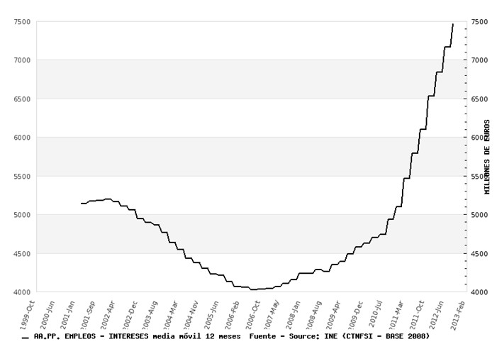 La otra gran partida en la que el gasto aumenta con mucha fuerza son los intereses de la creciente deuda, que aumentan un 14,4% respecto a hace un año y un 79,8% respecto a 2007. Aunque el gasto aún es pequeño respecto a otras partidas del presupuesto (1/4 del gasto en salarios y 1/6 del gasto en pensiones y desempleo), es muy preocupante la evolución exponencial de éste.