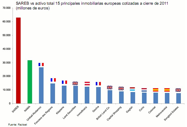 Esta cifra supone, además, prácticamente el doble de lo que tiene el Nama (agencia nacional de gestión de activos de Irlanda), más conocido como el banco malo irlandés, que cuenta con unos 32.000 millones de euros en inmuebles. En este ranking de bancos malos y de inmobiliarias europeas, se sitúa en el tercer puesto la empresa de inversión inmobiliaria francesa Unibail-Rodamco, con una cartera valorada en unos 26.000 millones de euros a cierre de diciembre de 2011. Esta compañía cuenta en España con 16 centros comerciales, como La Vaguada, Parquesur o el Equinoccio en Madrid, o La Maquinista y Barnasud en Barcelona.