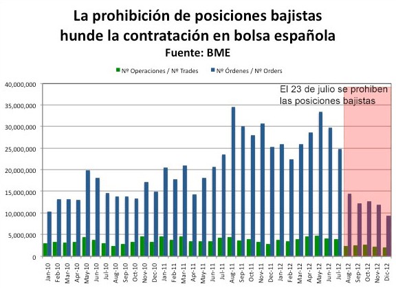 Además, la prohibición de cortos está generando efectos negativos en el mercado español. En su balance de 2012, BME advierte de que "la restricción sobre la toma de posiciones cortas" pesa "negativamente sobre los volúmenes de negociación" y, por tanto, "son frenos a la liquidez". Este hecho es reconocido incluso por la propia CNMV en diversos estudios, tal y como señala BME. "La posibilidad de tomar posiciones cortas tiene más efectos positivos que negativos", ya que "proveen de liquidez al mercado, al igual que cualquier otra estrategia que canalice órdenes" de compraventa.