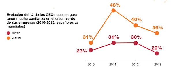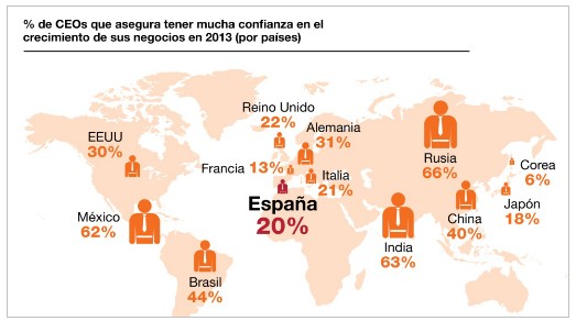 Los altos directivos españoles son partícipes de esta opinión. Un escaso 20% -16 puntos menos que sus colegas mundiales-, asegura tener "mucha confianza" en la evolución sus negocios este año. Un 44% prevé que la situación económica siga igual y un 34% espera que empeore. Esto sitúa a nuestros CEOS entre los más pesimistas, junto con los de otros países de nuestro entorno como Italia o Francia.