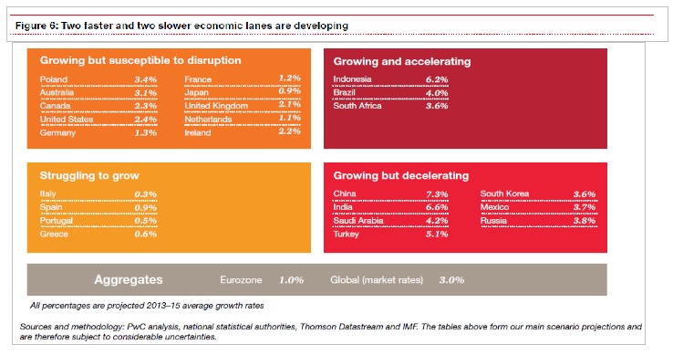 El documento, por primera vez, clasifica a las principales economías del mundo en cuatro grandes grupos en función del crecimiento medio esperado para el bienio 2013-2015 –ver cuadro-. El primero de ellos está integrado por los países en crecimiento pero con riesgos de desaceleración, entre los que se encuentra Estados Unidos, Alemania, Francia, Reino Unido o Japón. El segundo, formado por aquellos estados que está luchando por que sus economías emprendan esta senda, donde se encuentran España, Italia, Portugal y Grecia. Un tercero, que componen Indonesia, Brasil y Sudáfrica, que crecen a buen ritmo y se estima aceleren ese crecimiento. Y, por último, un cuarto grupo, integrado por países con economías que están creciendo pero están en fase de desaceleración, como China, India, Arabia Saudí.
