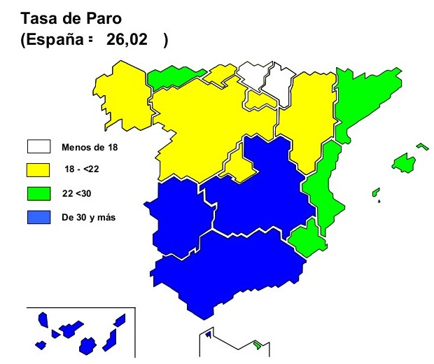 Así, las seis autonomías del sur, un tercio del total, registran un paro muy próximo o superior al 30%. Andalucía encabeza la lista, con un 35,9%, seguida de Extremadura (34%), Canarias (33%), Castilla-La Mancha (30%), Murcia (29,6%) y Comunidad Valenciana (28,1%). El siguiente mapa ejemplifica dicha división.