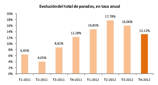 Por otro lado, el aumento interanual del paro se ha moderado por tercer trimestre consecutivo, pasando del 18% en el segundo trimestre de 2012 al 13% en el cuarto, al tiempo que la tasa de destrucción de empleo se ha mantenido estable, superando el 4,5% interanual, a pesar de sufrir una mayor contracción económica.