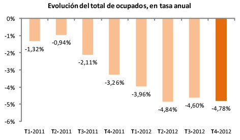 En cuanto al nivel de ocupación sucede algo similar, ya que la economía destruyó 460.000 empleos en el segundo semestre de 2012, casi 35.000 menos que en el mismo período de 2011 (495.500), según los últimos datos de la Encuesta de Población Activa (EPA). La diferencia es aún más relevante si tan sólo se tiene en cuenta el empleo privado: 336.200 frente a los 414.000 empleos destruidos en la segunda mitad de 2011.