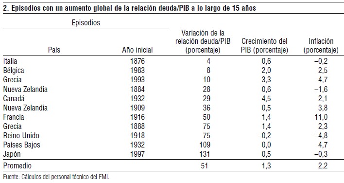 Desde 1875, el FMI identifica cuatro épocas en las que se concentran los principales episodios de explosión de deuda pública (aunque también analiza otros desarrollados de forma aislada en determinados países). Estos momentos de generalización de los
