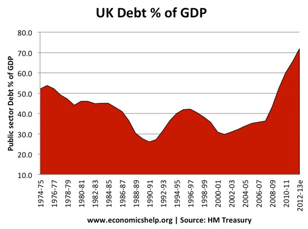 La situación empezó a cambiar en los años de Gordon Brown: entre 2007 y 2010, el sucesor de Tony Blair disparó la deuda pública del 37% al 57% del PIB. Tras la llegada de los conservadores al poder, el aumento experimentado por la deuda pública siguió su tendencia alcista, pasando a superar el 70% del PIB. La siguiente gráfica, que toma el periodo 1974-2013, muestra el continuo aumento de la deuda pública desde el año 2000.