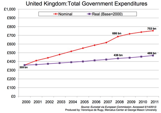 En ambos casos, encontramos que el gasto no ha parado de crecer durante el periodo estudiado. Descontando el efecto de la inflación, vemos que entre 2008 y 2011 el gasto público crece de 436.000 a 469.000 millones de libras: un aumento del 7,5% que desmonta la supuesta "austeridad" del gobierno británico.