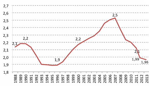 En concreto, España sufrió en 2012 un descenso de 318.100 personas de entre 16 y 64 años, hasta un total de 30,3 millones, según la última Encuesta de Población Activa (EPA). Parte de esta caída respondería a la salida de unos 200.000 nacionales y extranjeros hacia otros países para encontrar trabajo, pero otra se debería a factores meramente demográficos (unas 120.000 personas), como resultado de la baja natalidad y el progresivo envejecimiento de la población, según las estimaciones de Alejandro Macarrón Larumbe, consultor de estrategia empresarial y corporate finance y autor del libro El suicidio demográfico de España.