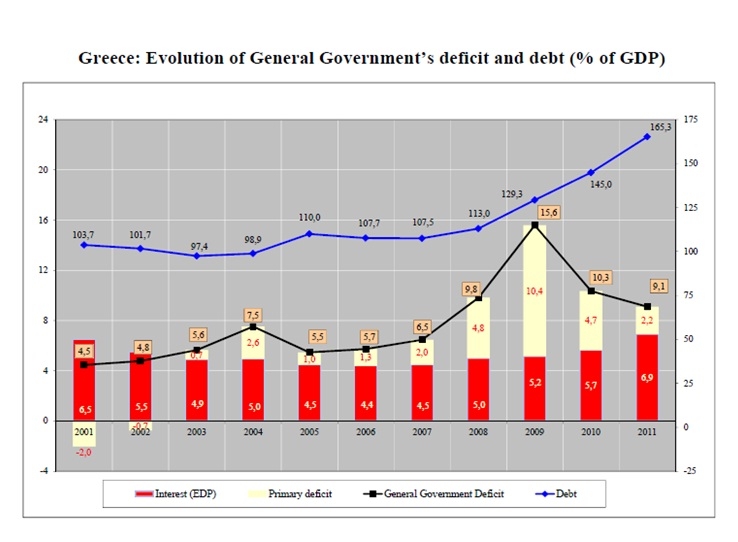 A lo largo de estos años, la vulnerabilidad de Grecia a shocks económicos ajenos fue en aumento. Los recurrentes déficits presupuestarios y el aumento del endeudamiento público consiguieron que el país rebasase los niveles de "intolerancia a la deuda" que Kenneth Rogoff y Carmen Reinhart identifican como punto de inflexión de cara a enfrentar una crisis. Además, la tenencia de deuda griega en el extranjero pasó de menos del 50% a casi el 80% entre 2001 y 2009.