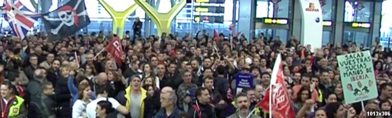 Bajo el grito de "Iberia no se vende, Iberia se defiende" los trabajadores se crecieron ante una concentración que estaba superando todas las expectativas. Tanto, que la escasez de antidisturbios facilitó que la multitud rompiese el cordón policial para trasladar sus protestas al interior de la terminal. Miles de personas pasaron a la fuerza a través de unas puertas que se quedaban pequeñas. Las pasarelas vibraban ante las carreras y botes de los manifestantes, y las caras de susto entre los que asistían perplejos a una protesta que les resultaba ajena comenzaron a multiplicarse.