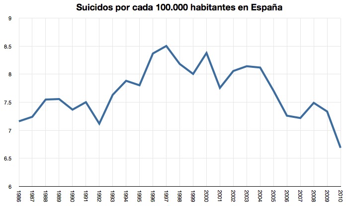 Así, según el Instituto Nacional de Estadística (INE), en España se suicidaron un total de 3.145 personas en 2010 (última cifra publicada), la cifra más baja en 17 años. De hecho, el número de suicidios por cada 100.000 habitantes se situó en 5,8, la tasa más baja en 25 años, inferior a la registrada en plena burbuja inmobiliaria (entre 6 y 7), según datos Eurostat, y por debajo de la tasa que presentan economías mucho más sólidas, tales como Alemania (9,9), Holanda (8,8) o Finlandia (16,8). La media de suicidios en la UE-27 se situó en 10,2 en 2010, casi el doble que España.