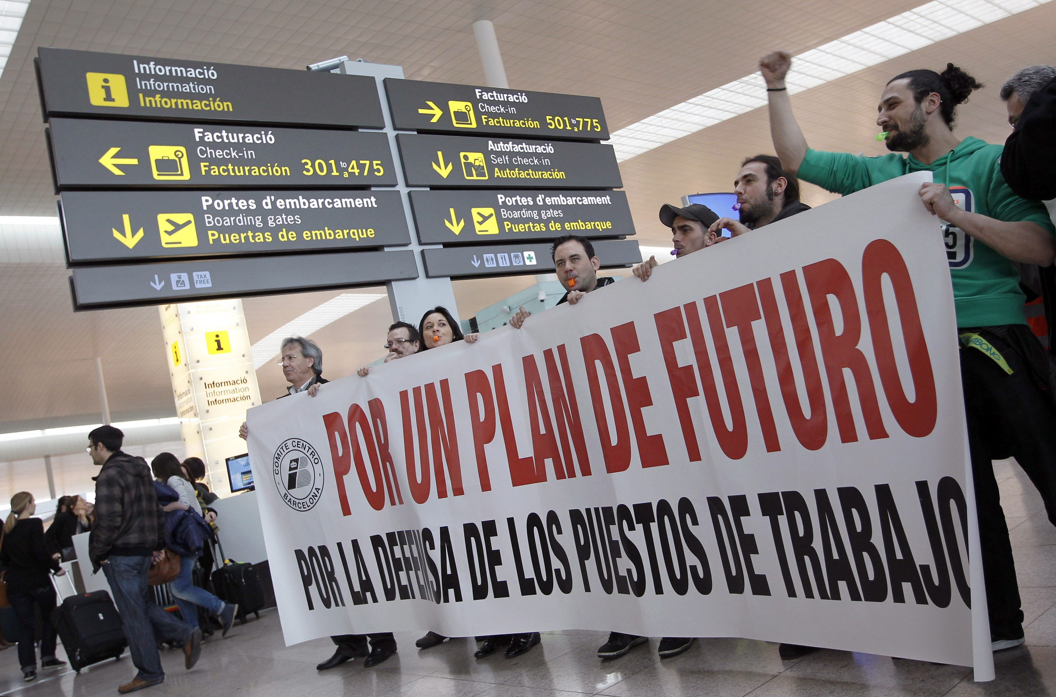 Un grupo de trabajadores de la compañía piden un plan de futuro para los trabajadores y para la aerolínea española en el aeropuerto de Barcelona.