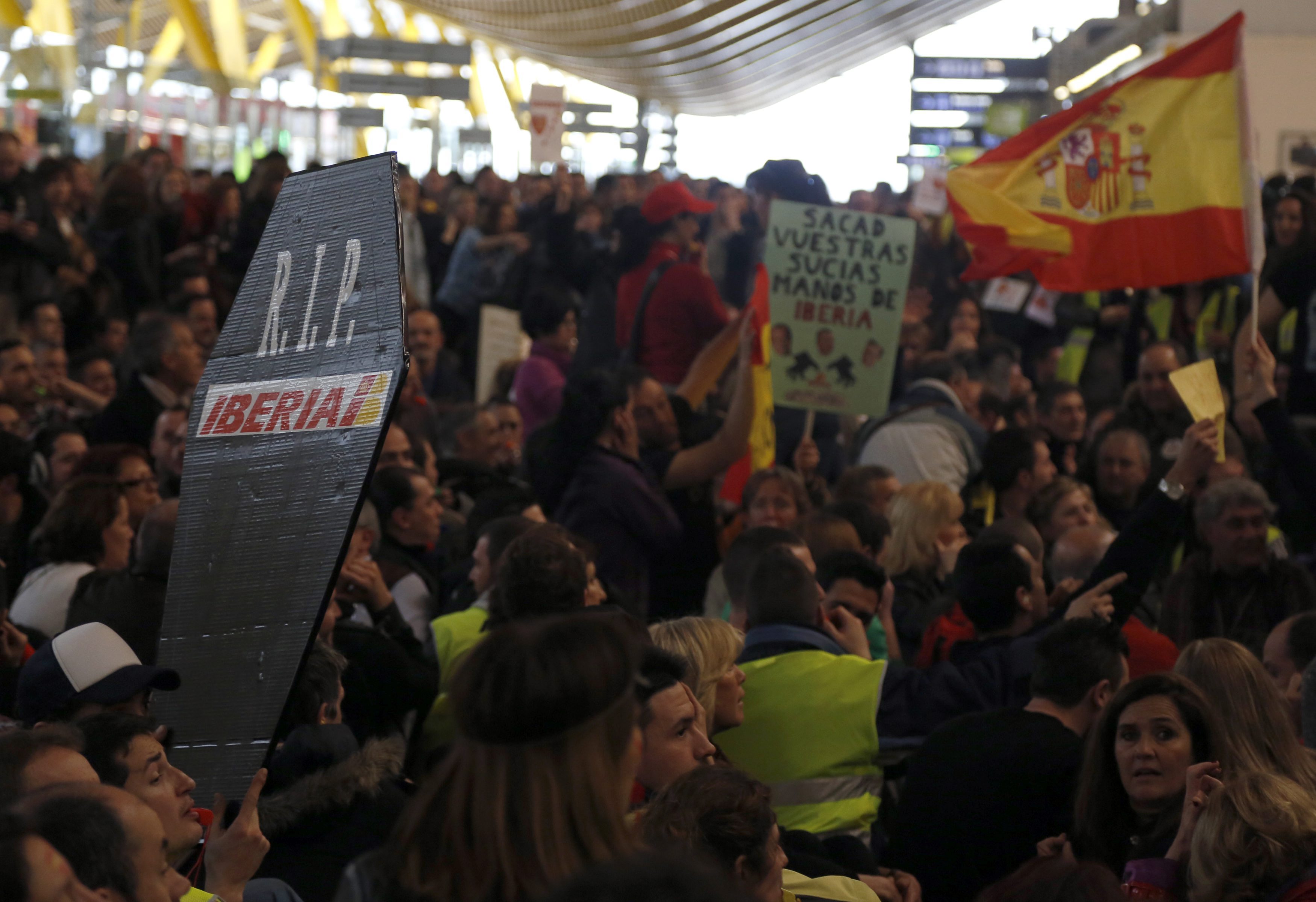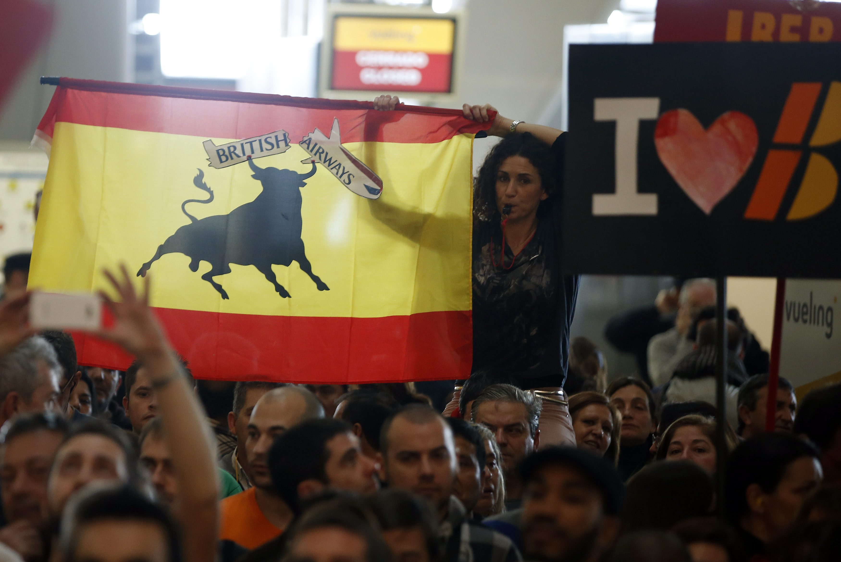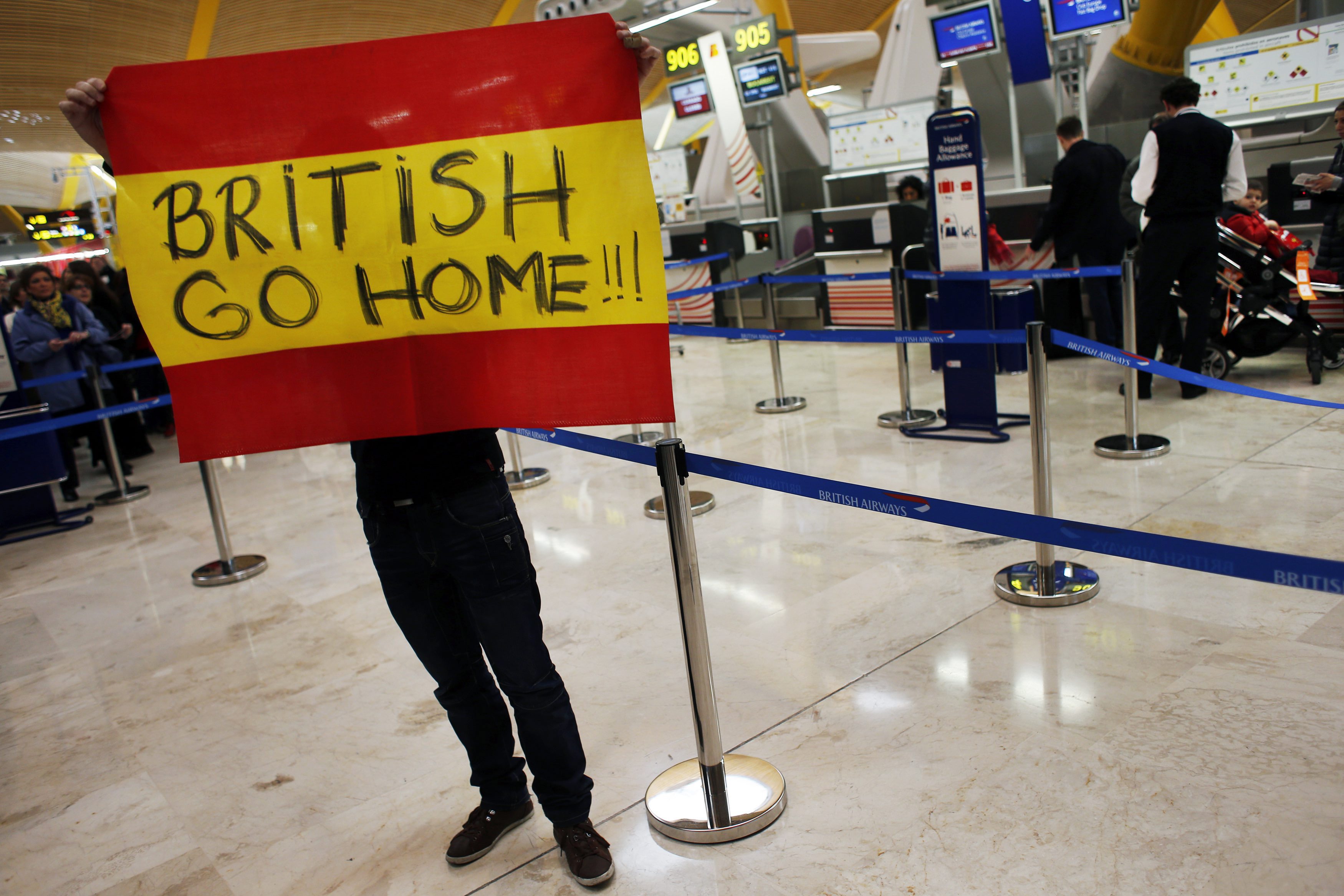 Los trabajadores de Iberia tenían claro su objetivo: los mostradores de Bristish Airways. "Vuestro presidente es un delincuente". Algunos consiguieron incluso entrar en el sistema el sistema informático y se podía leer en las pantallas de destino el mismo mensaje que lleva el chico en la bandera: British go home.
