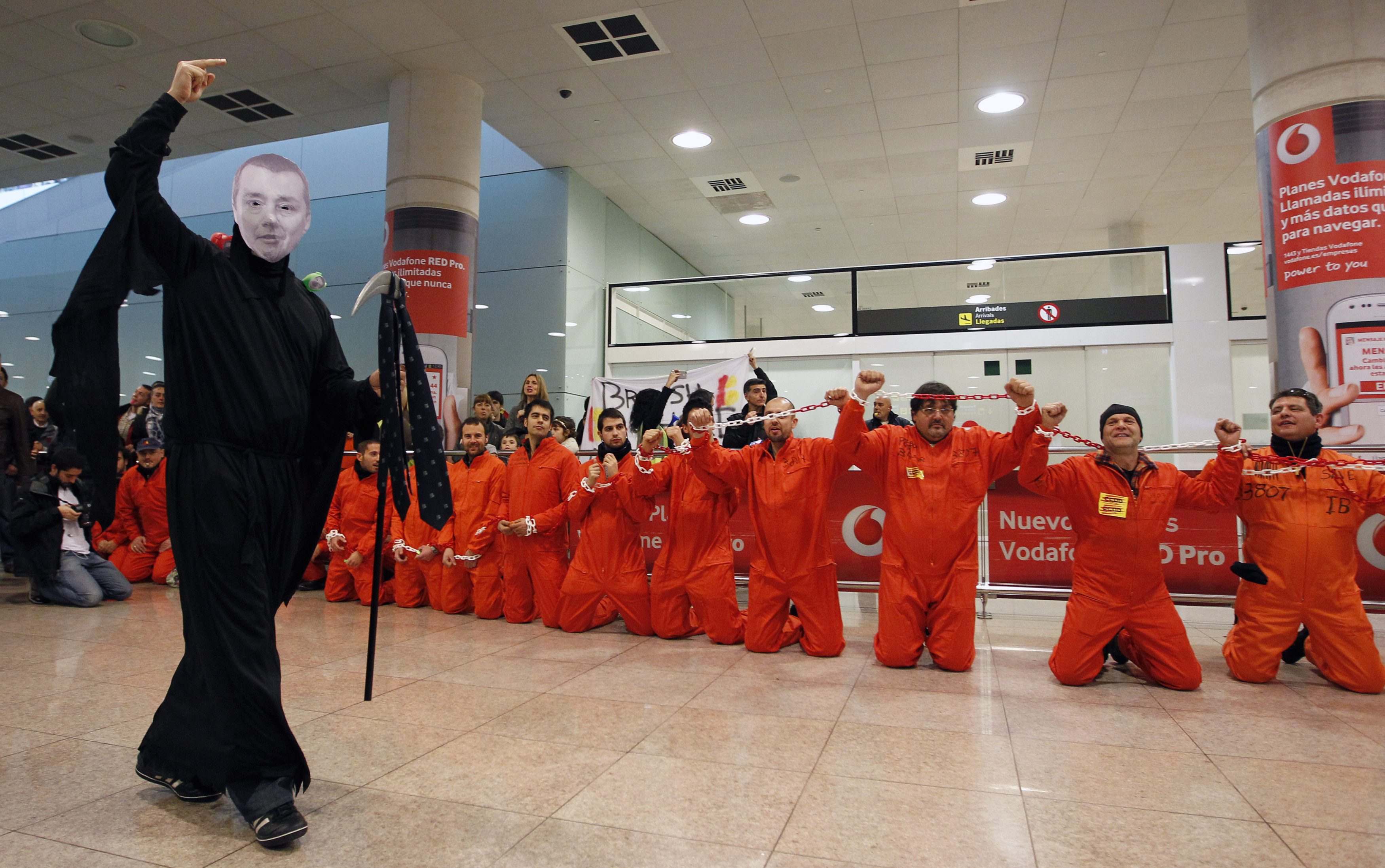 Los trabajadores de Iberia simulan ser presos de la compañía en el aeropuerto de Barcelona.