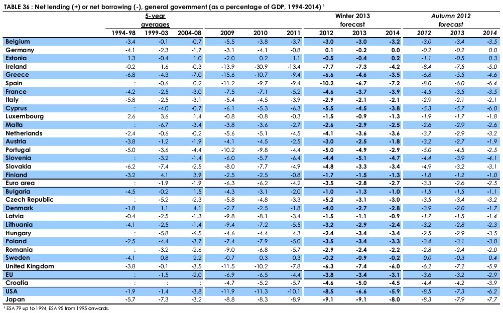 El déficit del 10,2% deriva de la brecha existente entre gastos e ingresos totales. Según el informe de la Comisión, el gasto público ascendió 486.700 millones de euros en 2012 (46,4% del PIB) frente a 480.100 millones en 2011 (45,1%), mientras que la recaudación se situó en 380.200 millones (36,3% del PIB) frente a 379.700 millones (35,7%), respectivamente. Así pues, el gasto creció un 1,3% interanual (incluyendo ayudas bancarias) y los ingresos poco más del 0,1%.