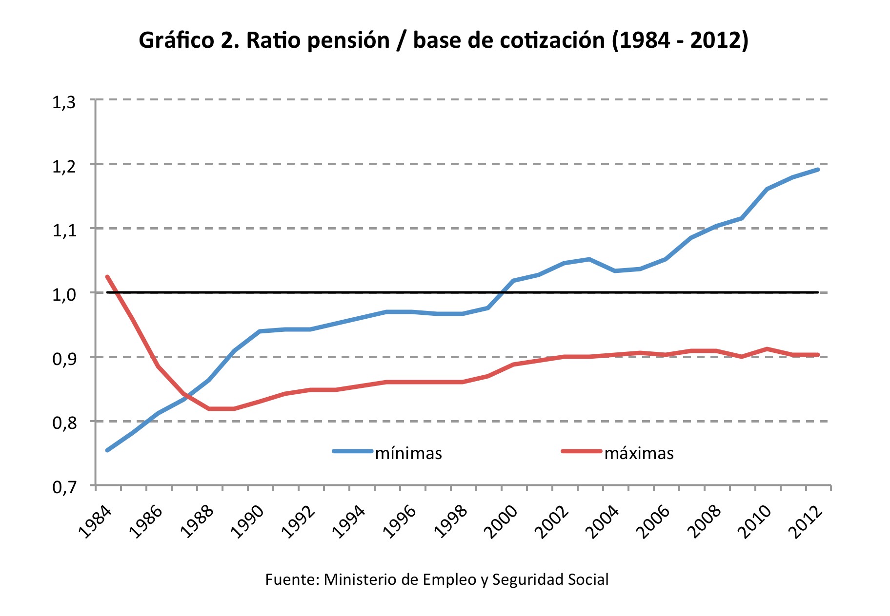 Los profesores José I. Conde-Ruiz y Clara I. González lo han puesto de manifiesto en un trabajo, publicado el pasado noviembre por la propia Seguridad Social, titulado La Reforma silenciosa: los efectos de los límites máximos y mínimos (de cotización y pensiones) sobre la sostenibilidad del sistema. Según los autores, "la política seguida durante los últimos 15 años muestra dos tendencias claras: el ratio pensión mínima y base mínima ha aumentado hasta el 1,2 (lo cual quiere decir que si un trabajador cotiza por la base mínima toda su vida laboral la pensión que percibe es un 20% superior a dicha base),