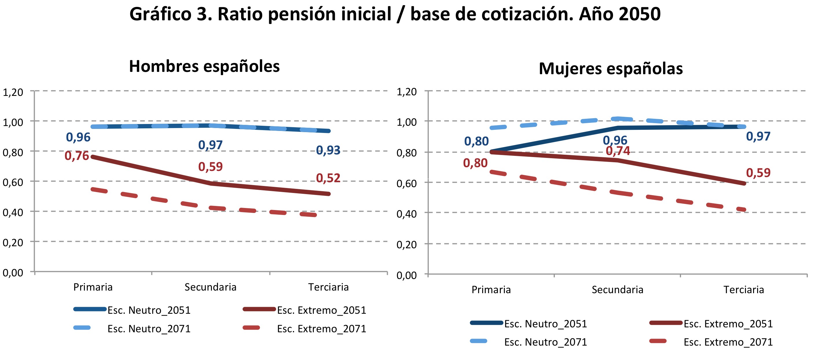 - Ahorro: es evidente que, si se mantiene la tendencia, será más barato pagar las prestaciones de jubilación del futuro. Según los cálculos de Conde-Ruiz y González, "en el caso más extremo puede suponer un ahorro de 3,2 puntos del PIB en 2050 y 6 puntos en 2070", más que la mayoría de las reformas del sistema propuestas hasta el momento.