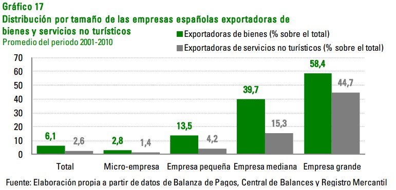 - Más tamaño (ver debajo gráficos 1 y 2): como publicábamos este domingo en Libre Mercado, la estructura productiva española carece de lo que podríamos denominar como "clase media empresarial". El porcentaje de microempresas es mucho más elevado que en los países de nuestro entorno. Y, como explican los autores del informe "para la exportación es necesaria una masa crítica mínima, generalmente coincidente con la empresa mediana". A igualdad de tamaño, las compañías son igual de productivas que sus pares alemanas o francesas (algo que también ratifica el Círculo de Empresarios); el problema es que les cuesta alcanzar esa "masa crítica" de la que habla el documento.