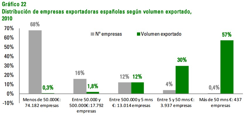 De hecho, no sólo es una cuestión de microempresas frente compañías de tamaño medio. En la estructura productiva nacional faltan también grandes conglomerados industriales. En determinados sectores, para competir en costes y flexibilidad, es imprescindible crecer (bien sea de forma interna o uniéndose con competidores). En estos momentos, el 90% de las exportaciones las realizan unas 4.000 empresas y el 10% restante se lo reparten otras 125.000.