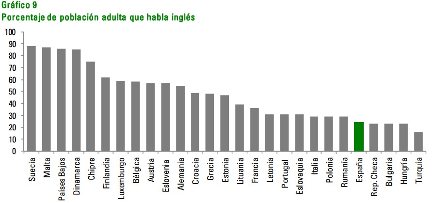 - Más inglés (gráfico 3): éste es un clásico. Entre los españoles, es un lugar común el bajo nivel de inglés de sus compatriotas, incluso entre los de un nivel educativo medio-alto. Son comunes las anécdotas sobre políticos que no hablan ninguna otra lengua y tienen que tirar de traductores para cualquier reunión con sus colegas extranjeros. Y el problema es que no es sólo una cuestión de percepción. Los datos son tozudos: en España, "sólo un 20% de la población adulta habla inglés (aproximadamente 5% a nivel avanzado y 15% a nivel medio), lo que nos sitúa muy por debajo del 85% de Holanda, 55% de Alemania o Austria, 35% de Francia y 28% de Italia o Polonia".