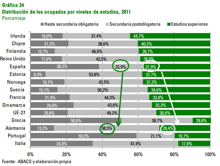 Mientras tanto, en Alemania lo más común es el titulado de nivel medio y más de la mitad de alumnos cursan FP, que aquí es el pariente pobre del sistema educativo. El modelo centroeuropeo, del que Austria o Suiza también comparten muchas de sus características, se basa en permitir una elección más temprana por parte de los alumnos, que con 12-14 años empiezan a escoger hacia dónde quieren dirigirse. Los datos son elocuentes: el 38% de los ocupados españoles tiene estudios superiores (el 28% en Alemania) y sólo el 23% tiene un título de nivel medio (58% en el país teutón).