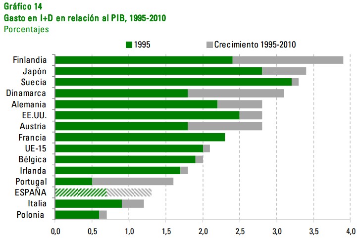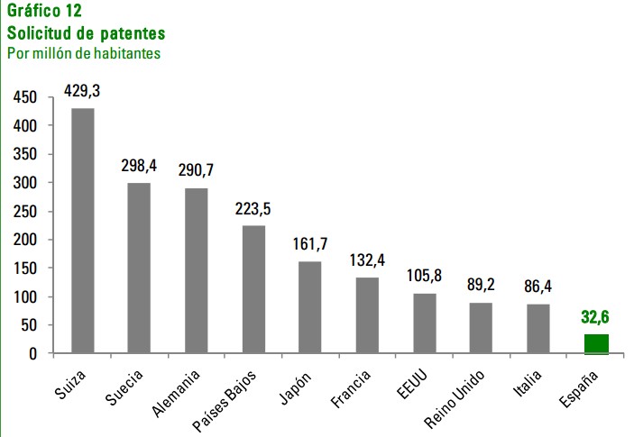 - Más I+D+i (gráficos 5 y 6): aunque es difícil que un político español que hable de la salida de la crisis más de diez minutos no pronuncie las palabras "innovación o nuevas tecnologías", lo cierto es que hasta ahora se ha quedado en un catálogo de buenas intenciones. España sigue siendo uno de los países que menos gasta en I+D+i, especialmente en lo que hace referencia al sector privado. Sólo las subvenciones públicas (muchas veces en actividades que no aportan ningún beneficio tangible) mantienen el nivel total de gasto. Mientras tanto, las empresas hacen frente a una regulación asfixiante, con nulos incentivos para las novedades. Así, "entre las 1.000 empresas europeas más innovadoras sólo hay 25 españolas; entre las 1.000 mundiales sólo seis". De nuevo, los autores del informe recuerdan que la inversión en "I+D privada está condicionada por el tamaño empresarial (las empresas de más de 250 trabajadores invierten en I+D casi el doble que las menores) por lo que, siendo el tamaño empresarial medio en España modesto, ello puede contribuir a explicar parte del déficit estructural en inversión en I+D".