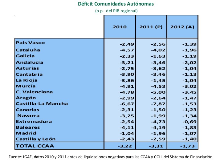 La seis autonomías que superaron dicho objetivo de déficit fueron Cataluña (1,96 %), Andalucía (2,02 %), Murcia (3,02 %), Comunidad Valenciana (3,45 %), Castilla-La Mancha (1,53 %) y Baleares (1,83 %).
