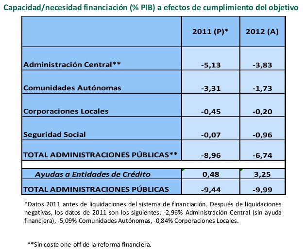 Esta cifra contrasta con el déficit del 8,96% de 2011, equivalente a 95.266 millones de euros. Dicho de otro modo, sin ayudas financieras, el déficit bajó en 24.444 millones (2,2 puntos del PIB), lo cual supone un recorte próximo al 25,6% interanual. Según datos oficiales, el grueso del ajuste presupuestario se concentró casi exclusivamente en el cuarto trimestre de 2012 (más de 19.000 millones de euros frente al recorte total de 24.444 millones). Pese a todo, España incumplió el objetivo del 6,3% del PIB fijado por Bruselas, tras desviarse al alza en 0,44 puntos del PIB (unos 4.625 millones de euros).