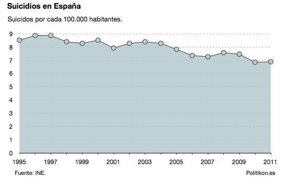 En concreto, según el INE, la tasa de suicidios por cada 100.000 habitantes no ha dejado de caer en la última década, incluso en plena crisis económica, hasta situarse en niveles mínimos de la serie histórica comparable, que arranca en 1995. De hecho, en 2007, en plena burbuja inmobiliaria, la tasa de suicidios era superior a la actual.