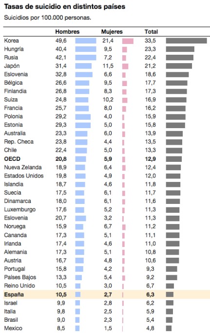 Otro indicador relevante es la comparación de los suicidios en España con el resto de países de la UE e incluso de la OCDE (economías más desarrolladas). Así, se observa que la tasa española (6,3 suicidios por cada 100.000 habitantes) es muy inferior a la media de la OCDE (12,9), según datos de 2010 (últimos disponibles). Además, en países en donde la crisis ha sido más suave o prácticamente inexistente, la diferencia es aún mayor: Alemania (10,8), Suiza (16,9), Finlandia (17,3) o Corea del Sur (33,5).
