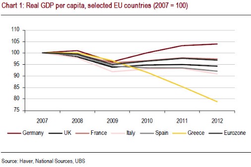 Los países periféricos, por su parte, se ven obligados, en mayor o menor medida, a acometer los ajustes exigidos. En un primer momento, esto se traduce en recesión y aumento del paro. La caída de la economía actúa así a modo de resaca para tratar de depurar los excesos y errores de inversión propios de la burbuja crediticia previa. Desde 2007, la renta per cápita ha descendido en los países periféricos, no así en Alemania, tal y como muestra el siguiente gráfico.