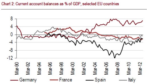 Por su parte, las reformas estructurales están logrando aumentar la competitividad económica de los denominados PIIGS (Portugal, Italia, Irlanda, Grecia y España), lo cual se refleja en la reducción e incluso práctica desaparición del déficit por cuenta corriente. De hecho, la balanza comercial conjunta de Portugal, Italia, Irlanda, Grecia y España registró superávit por primera vez en 2012 desde la entrada en el euro.