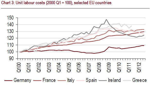 Asimismo, los costes laborales unitarios también han empezado a caer en los periféricos, reduciendo así la brecha de competitividad existente entre el norte y el sur de Europa.